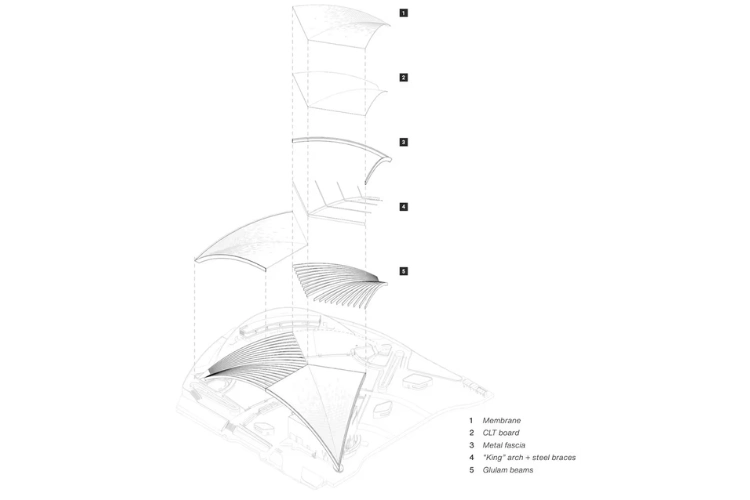 Depois entram os elementos de madeira laminada colada (glulam). Ao todo, são 180 segmentos pré-fabricados que formam 60 arcos distribuídos radialmente.